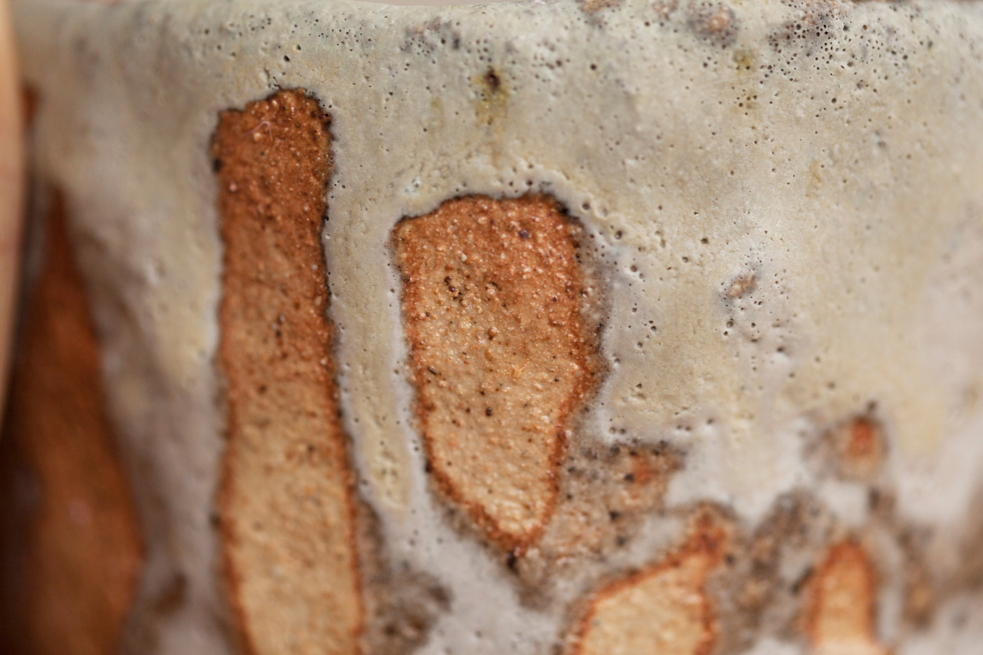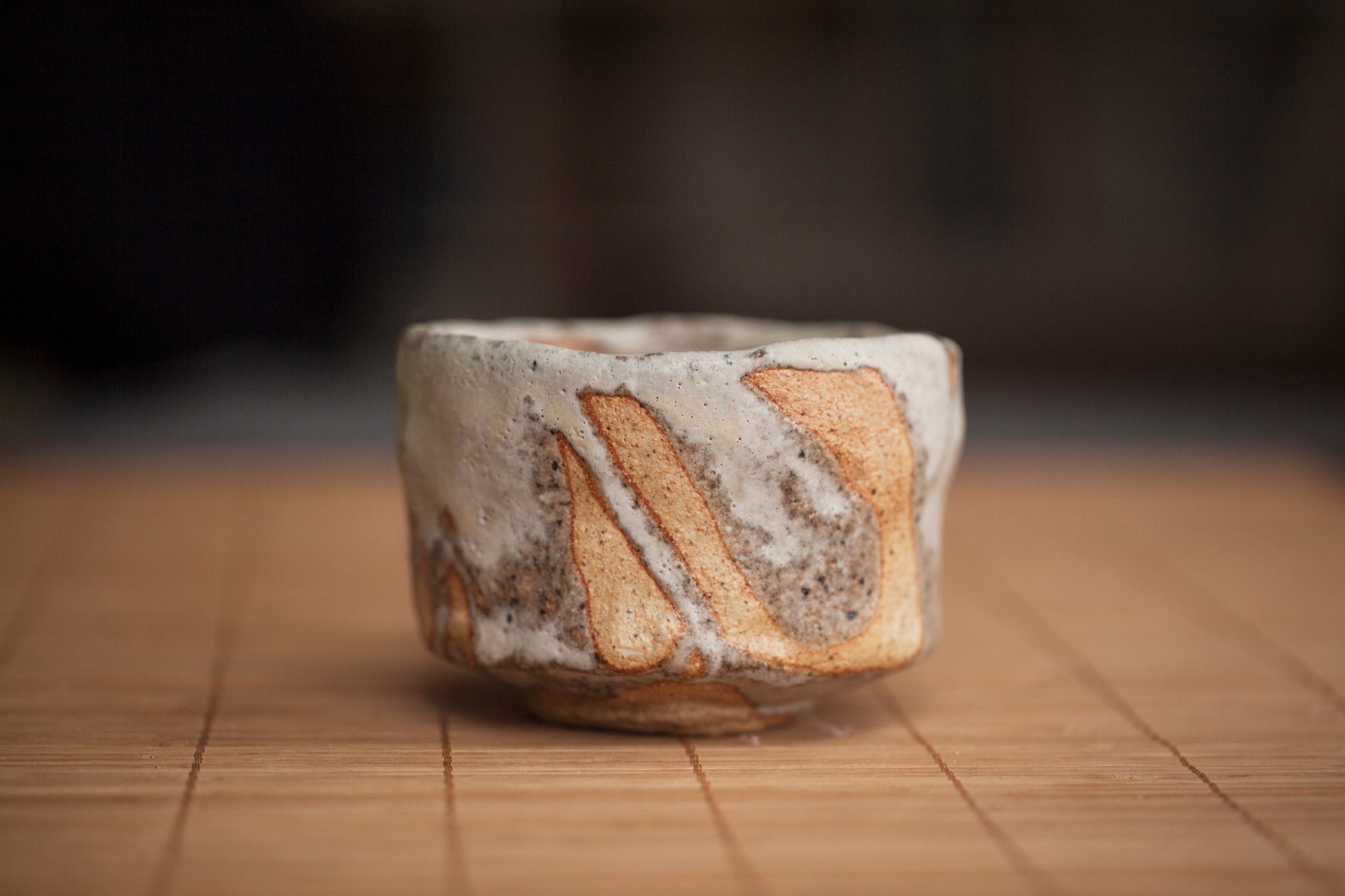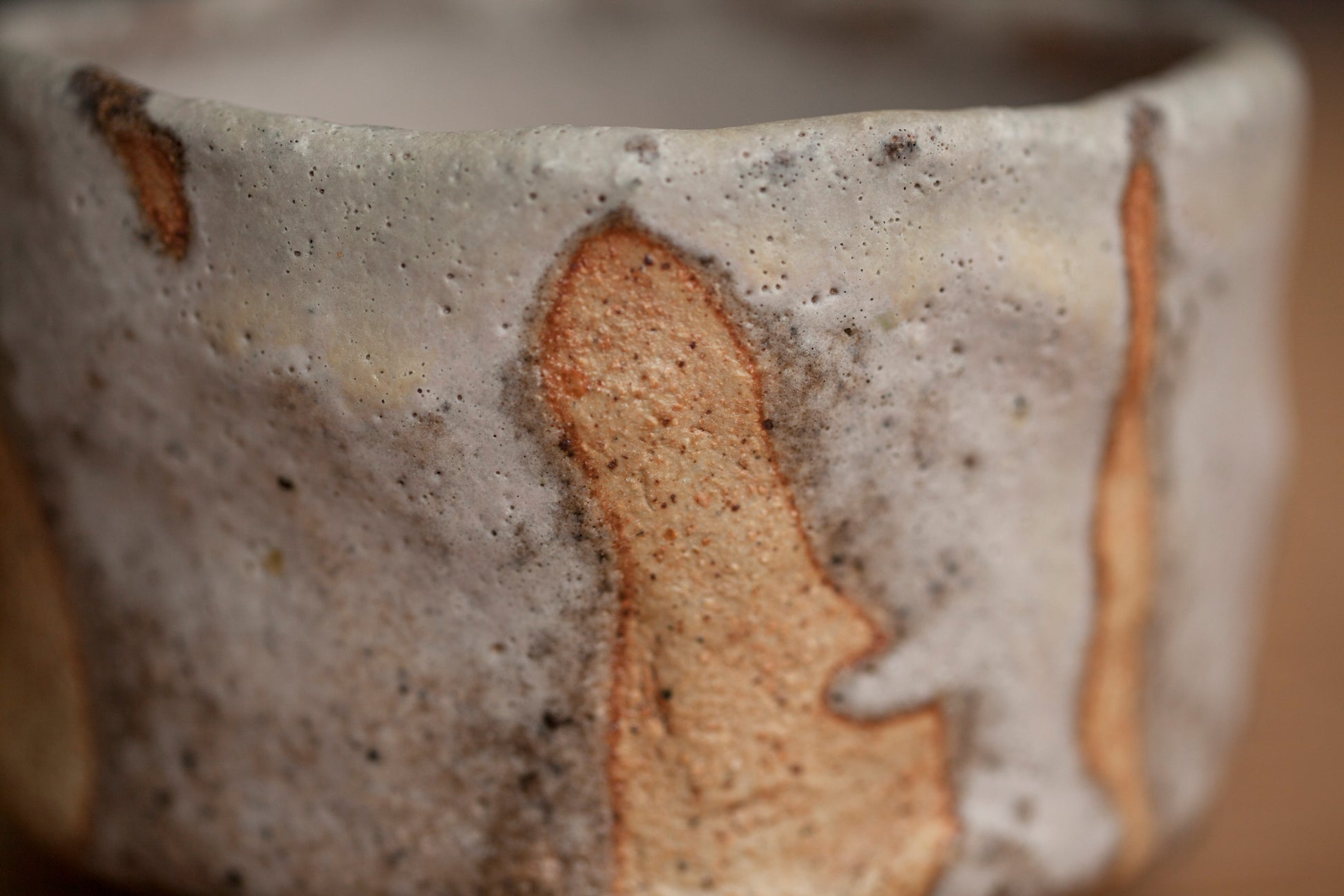 This tea bowl is covered with chino glaze and wood ash. Natural wood ash: pottery surface is left unglazed and takes on color and markings during the firing from the melted wood ash. It was fired in an anagama kiln for 80 hours. The temperature reached 1350 degrees (wood fired).