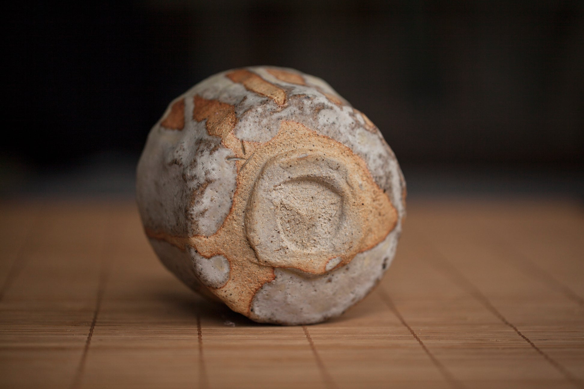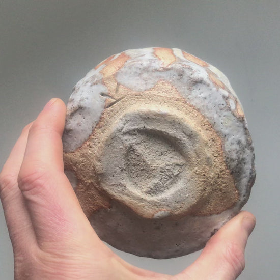This tea bowl is unique. I made all these tea bowls in my workshop. Its shape was created only by hands (Hand formed). Only hands, clay and iron or wood scraper. You can see fingerprints on the sides of the bowl.