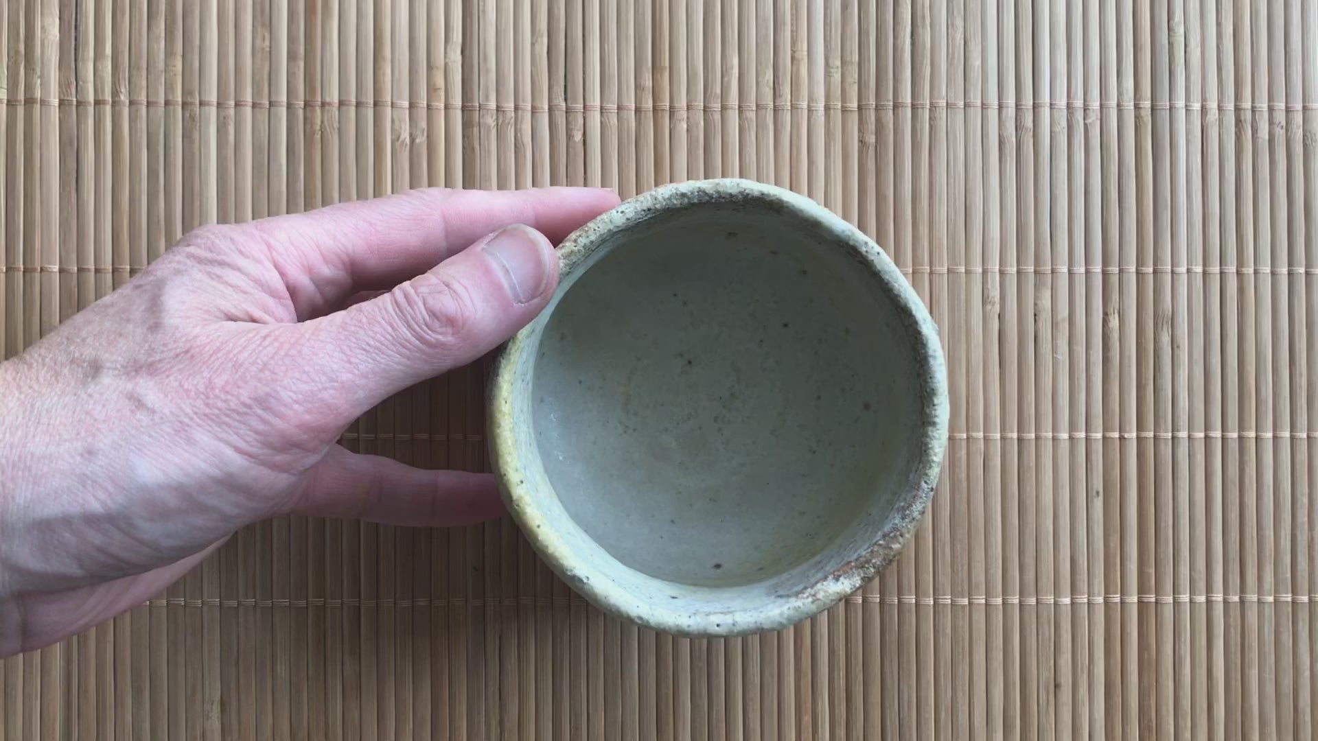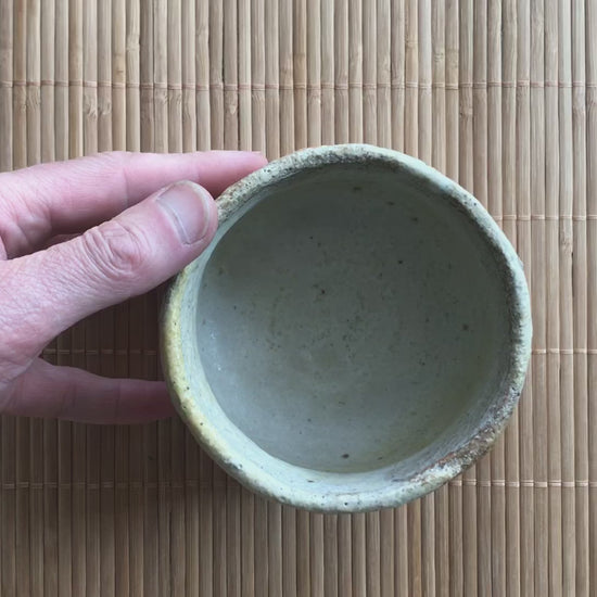 This tea bowl is unique. I made all these tea bowls in my workshop. Its shape was created only by hands (Hand formed). Only hands, clay and iron or wood scraper. You can see fingerprints on the sides of the bowl.