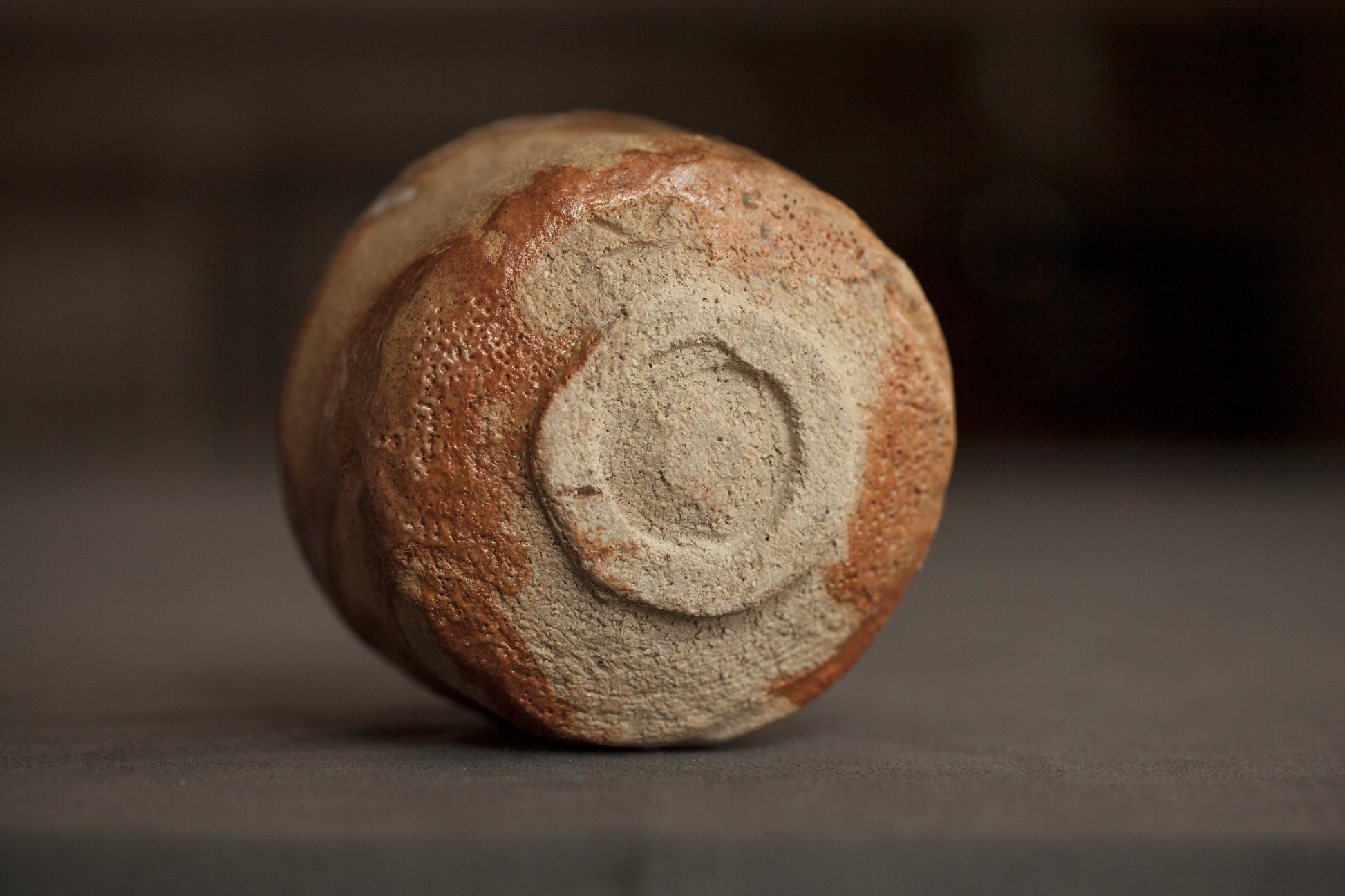 This tea bowl is covered with chino glaze and wood ash. Natural wood ash: pottery surface is left unglazed and takes on color and markings during the firing from the melted wood ash. It was fired in an anagama kiln for 80 hours. The temperature reached 1350 degrees (wood fired).