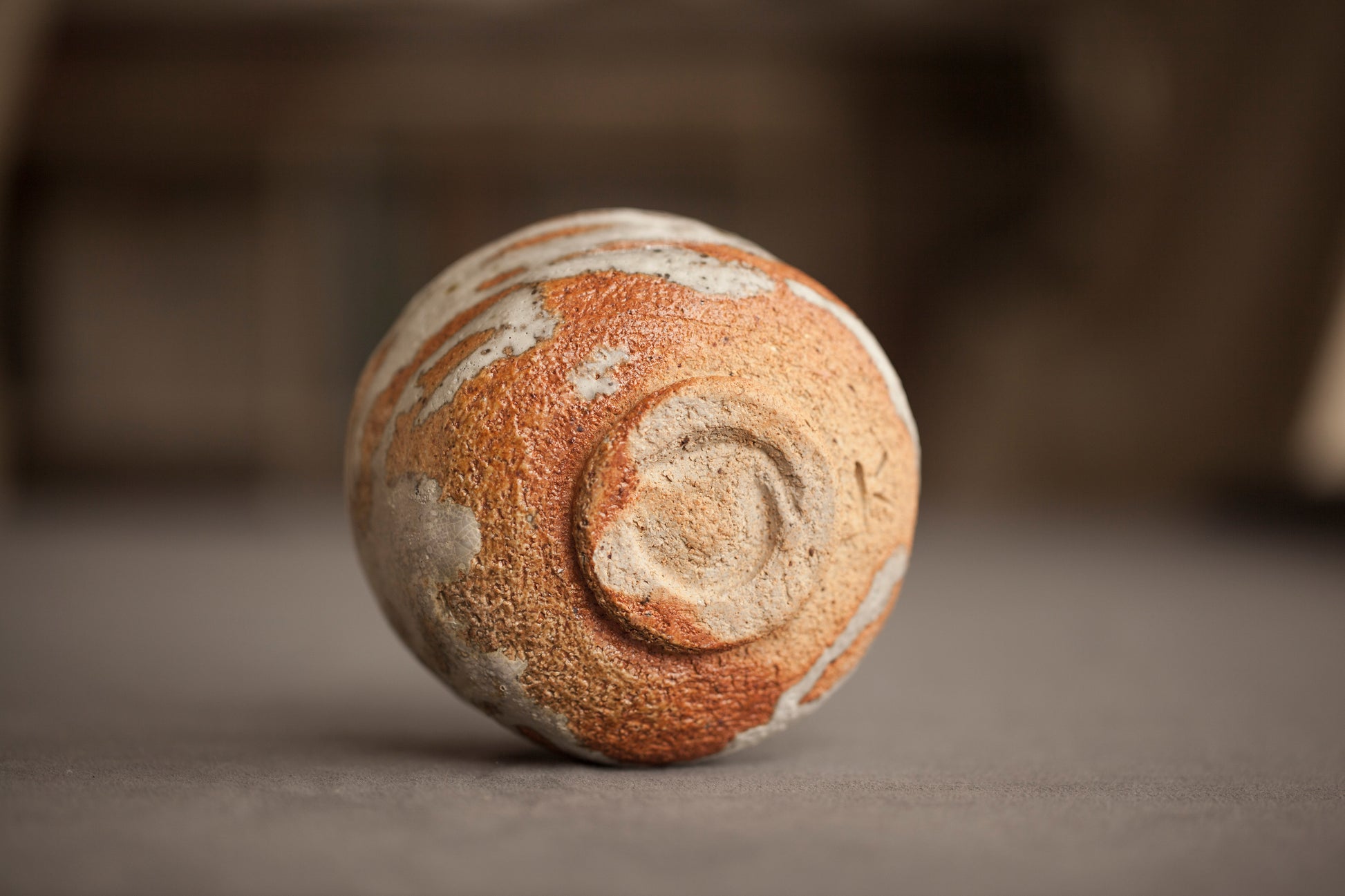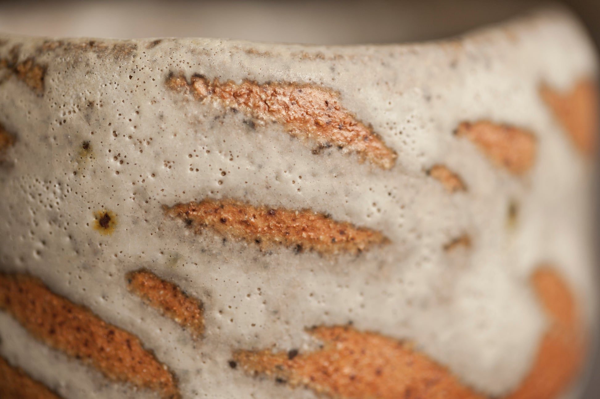 This tea bowl is covered with chino glaze and wood ash. Natural wood ash: pottery surface is left unglazed and takes on color and markings during the firing from the melted wood ash. It was fired in an anagama kiln for 80 hours. The temperature reached 1350 degrees (wood fired).