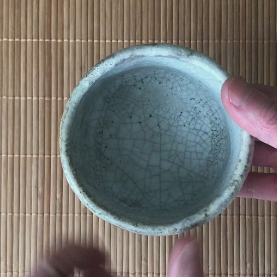 This tea bowl is unique. I made all these tea bowls in my workshop. Its shape was created only by hands (Hand formed). Only hands, clay and iron or wood scraper. You can see fingerprints on the sides of the bowl.