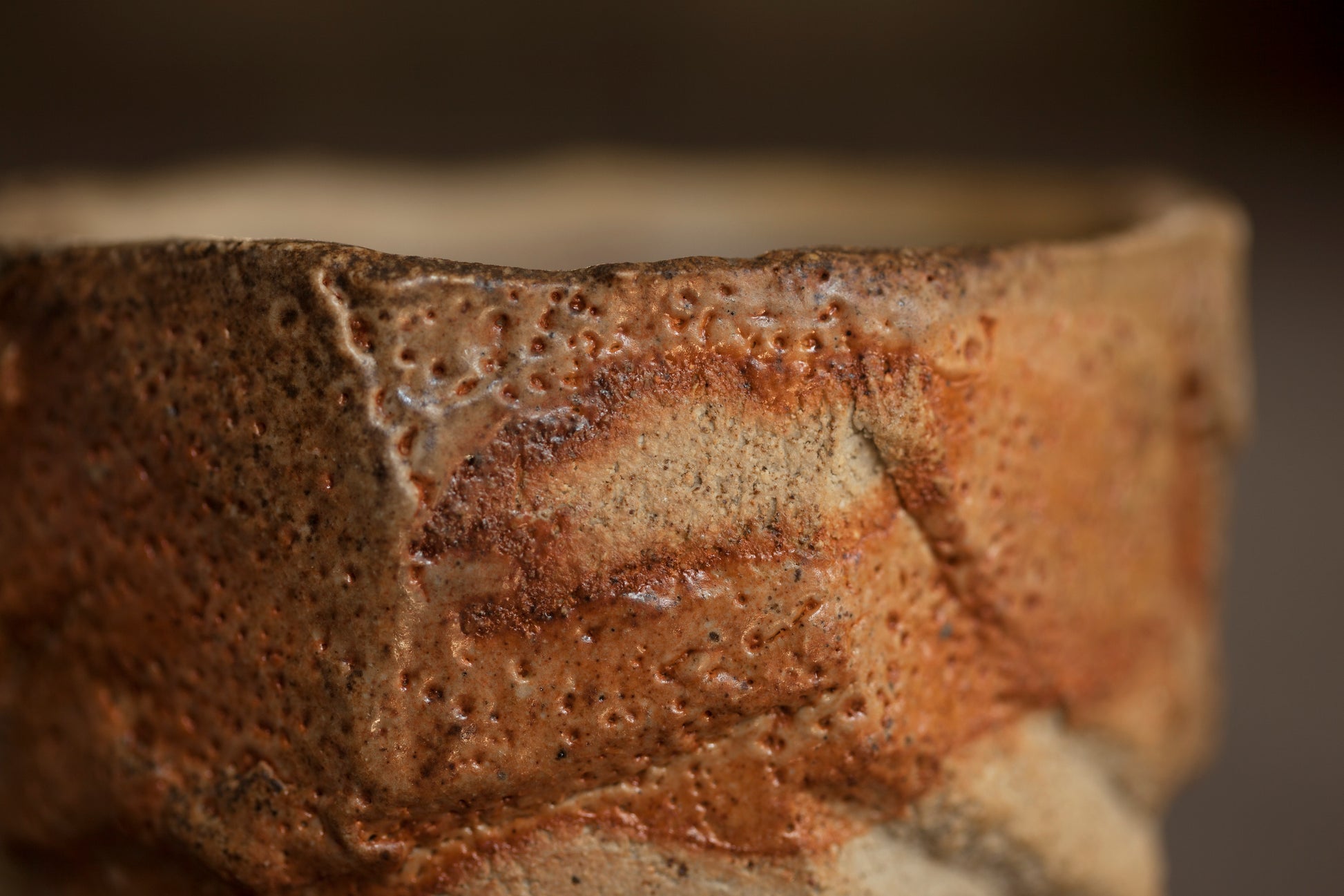 This tea bowl is covered with chino glaze and wood ash. Natural wood ash: pottery surface is left unglazed and takes on color and markings during the firing from the melted wood ash. It was fired in an anagama kiln for 80 hours. The temperature reached 1350 degrees (wood fired).