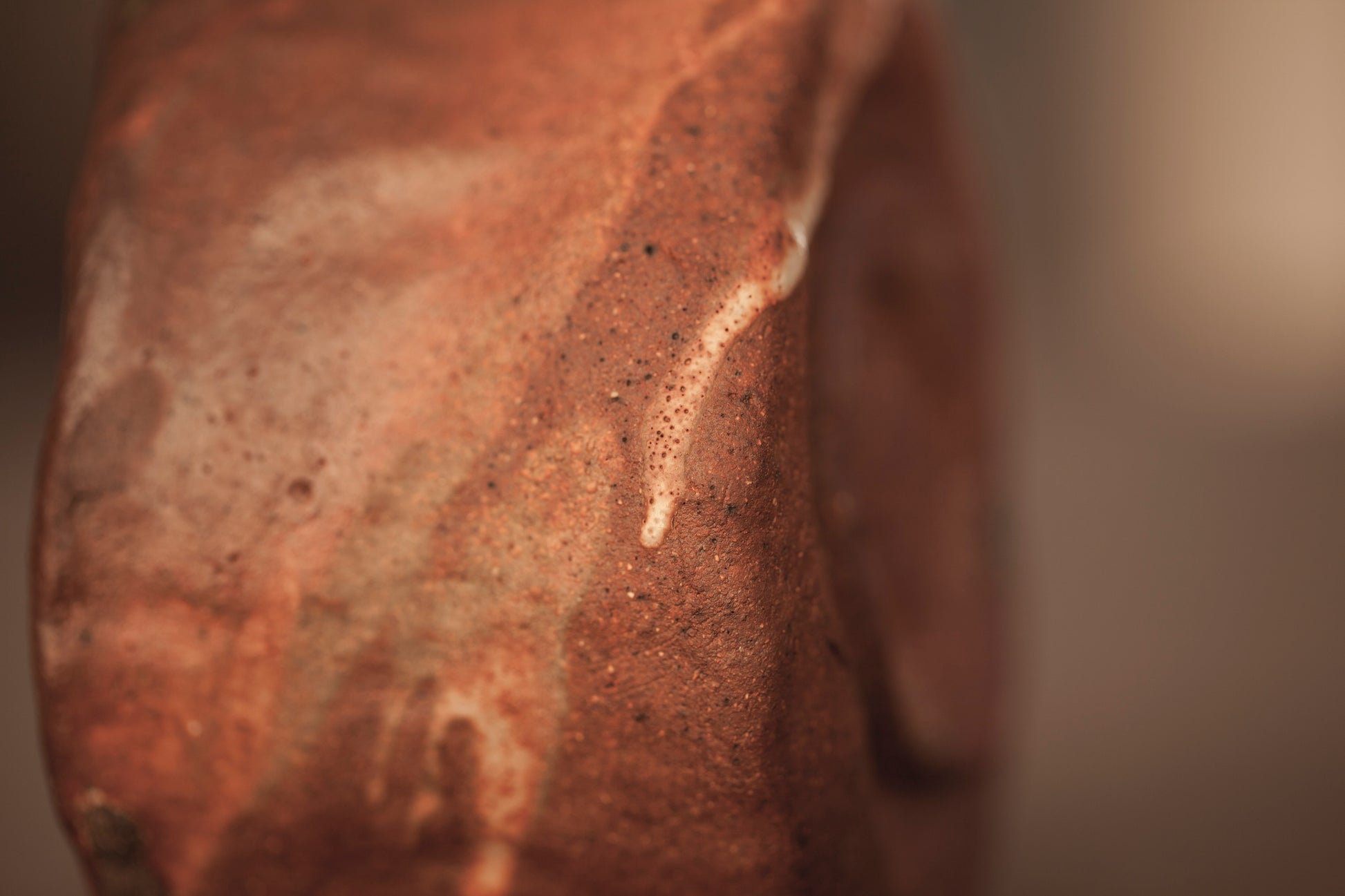 The Fire's Kiss: A Story of Resilience During the intense, high-heat environment of the Anagama wood-firing process, this chawan underwent a natural transformation. Under the immense pressure and extreme temperature, the base of the bowl slightly yielded and settled.
