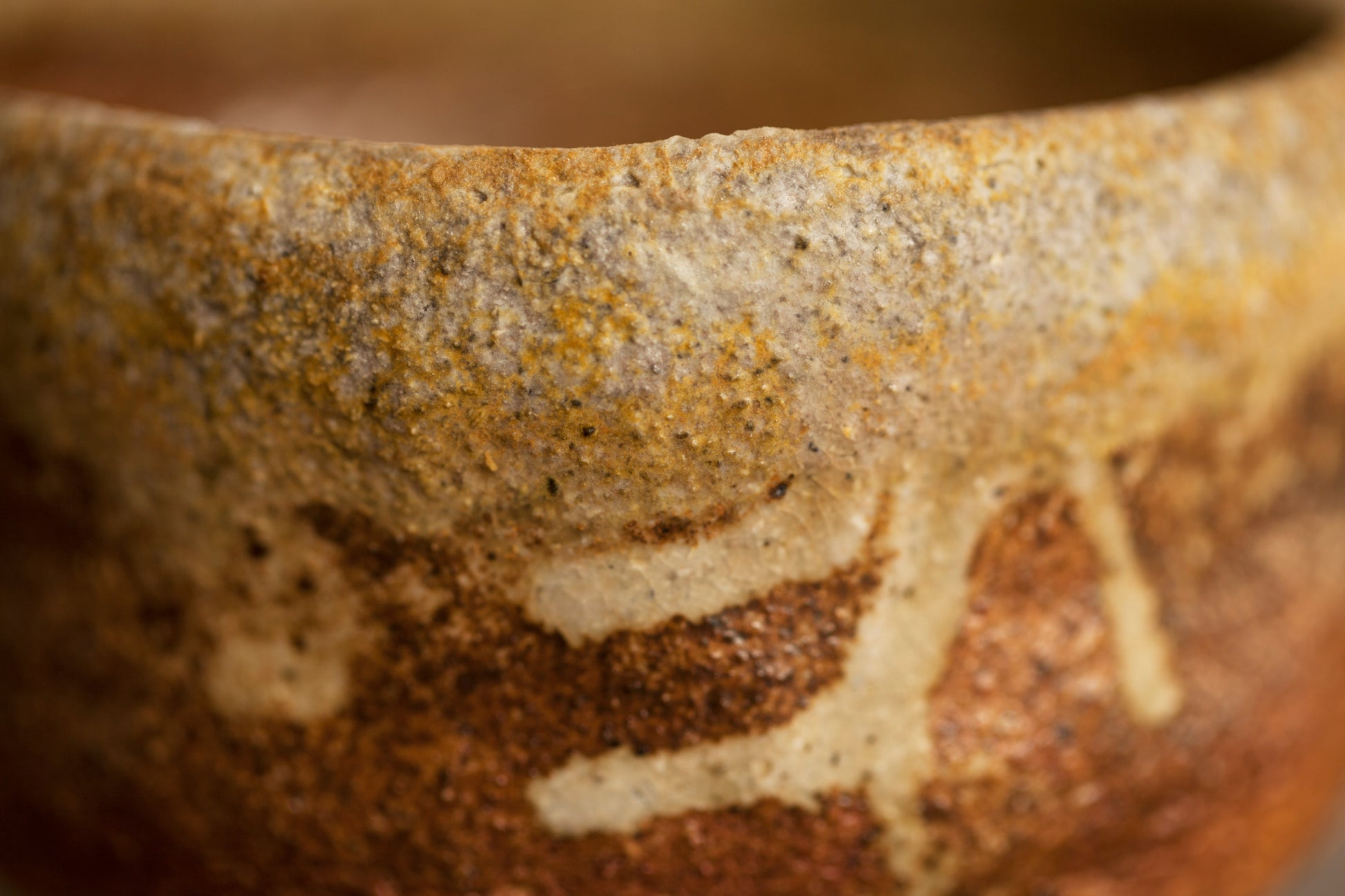 This tea bowl is covered with chino glaze and wood ash. Natural wood ash: pottery surface is left unglazed and takes on color and markings during the firing from the melted wood ash. It was fired in an anagama kiln for 80 hours. The temperature reached 1350 degrees (wood fired).