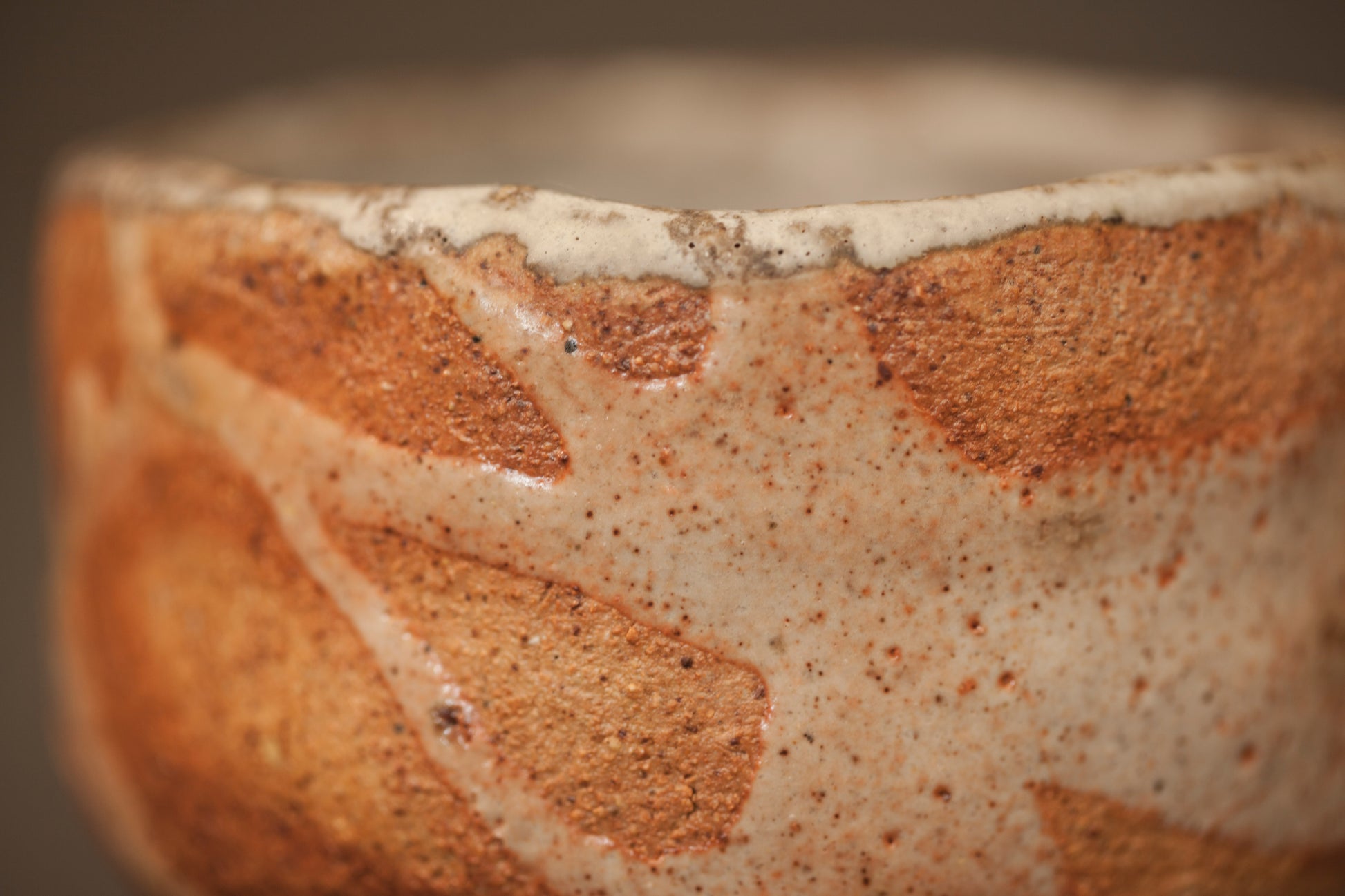 This tea bowl is covered with chino glaze and wood ash. Natural wood ash: pottery surface is left unglazed and takes on color and markings during the firing from the melted wood ash. It was fired in an anagama kiln for 80 hours. The temperature reached 1350 degrees (wood fired).