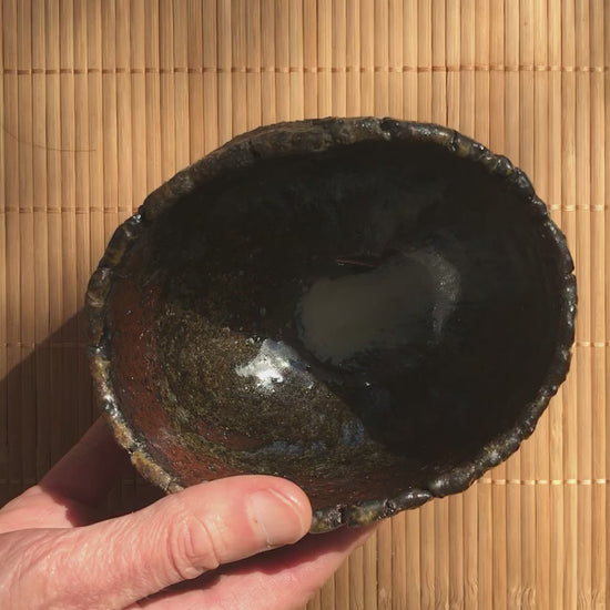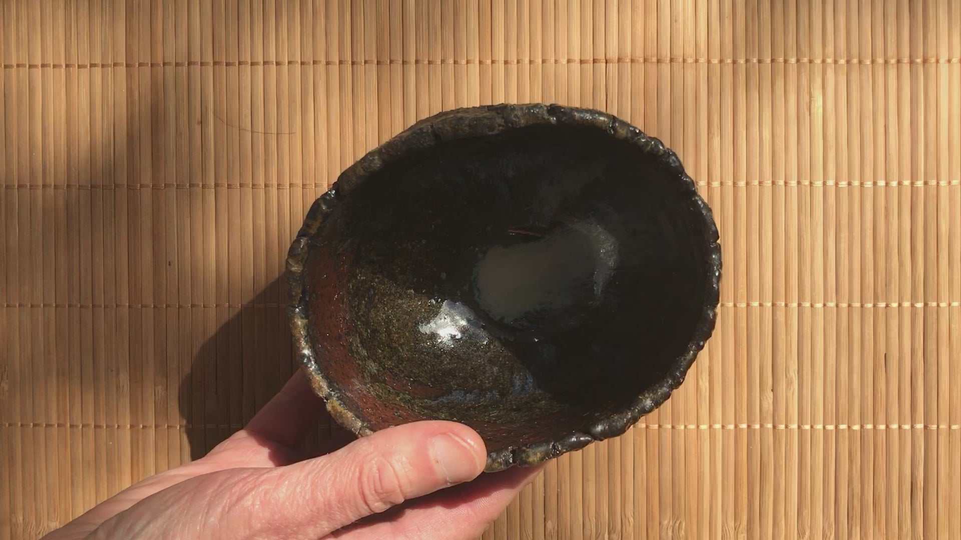 This tea bowl is unique. I made all these tea bowls in my workshop. Its shape was created only by hands (Hand formed). Only hands, clay and iron or wood scraper. You can see fingerprints on the sides of the bowl.