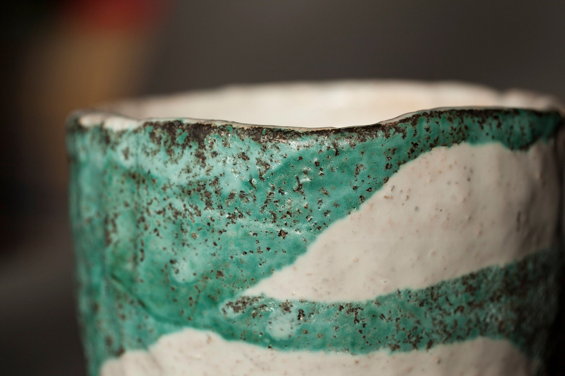 Chawan are molded using the "tezukune" technique, with the palms of the hand: clay is shaped into a dense, flat circle and built up by compressing between the palms. When dry enough, the rough and imperfect clay is trimmed with an iron scraper - "kurinuki" technique . Then it is covered with glaze and fired at high temperature. All glazes and clay used are “food safe”