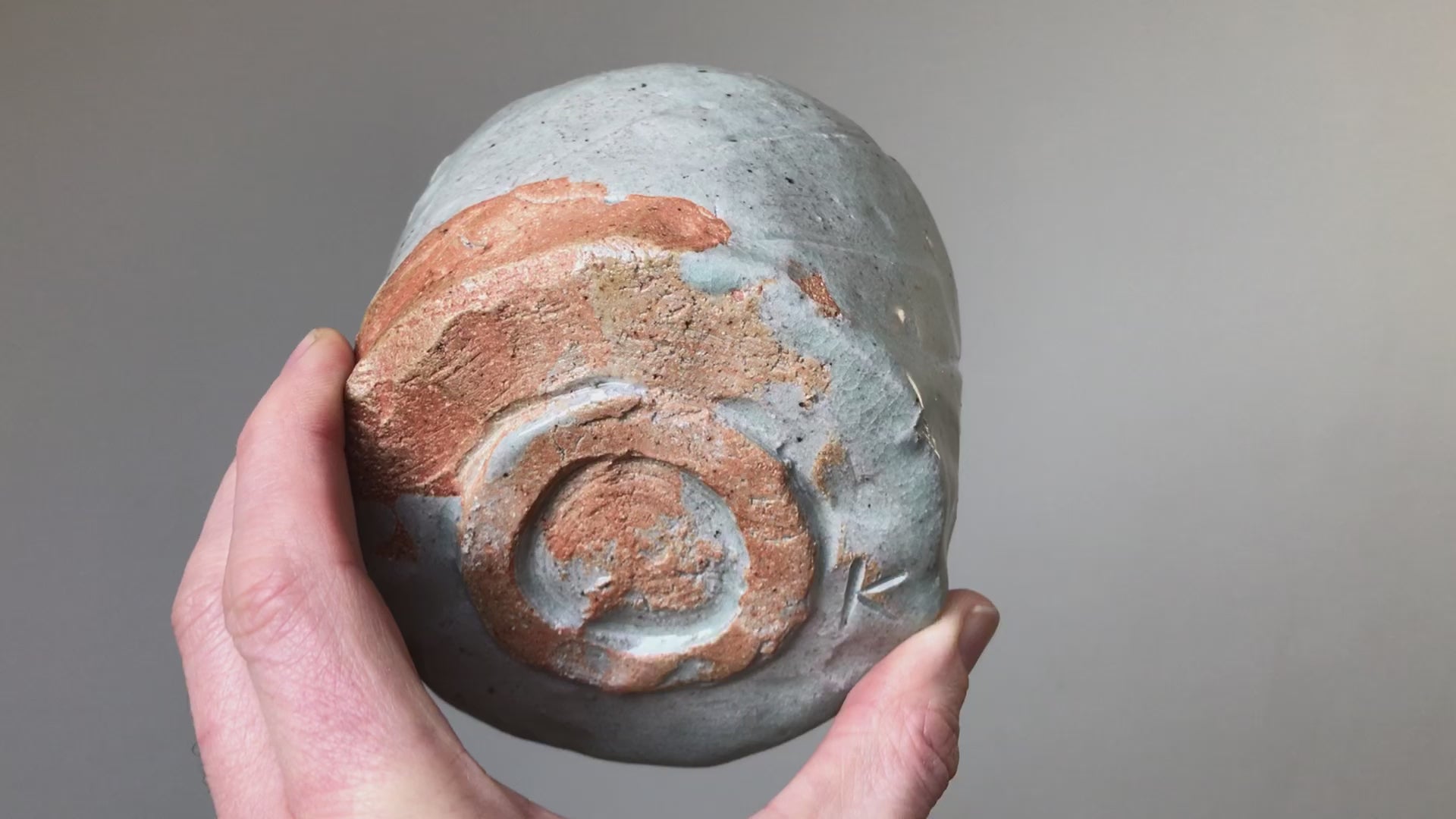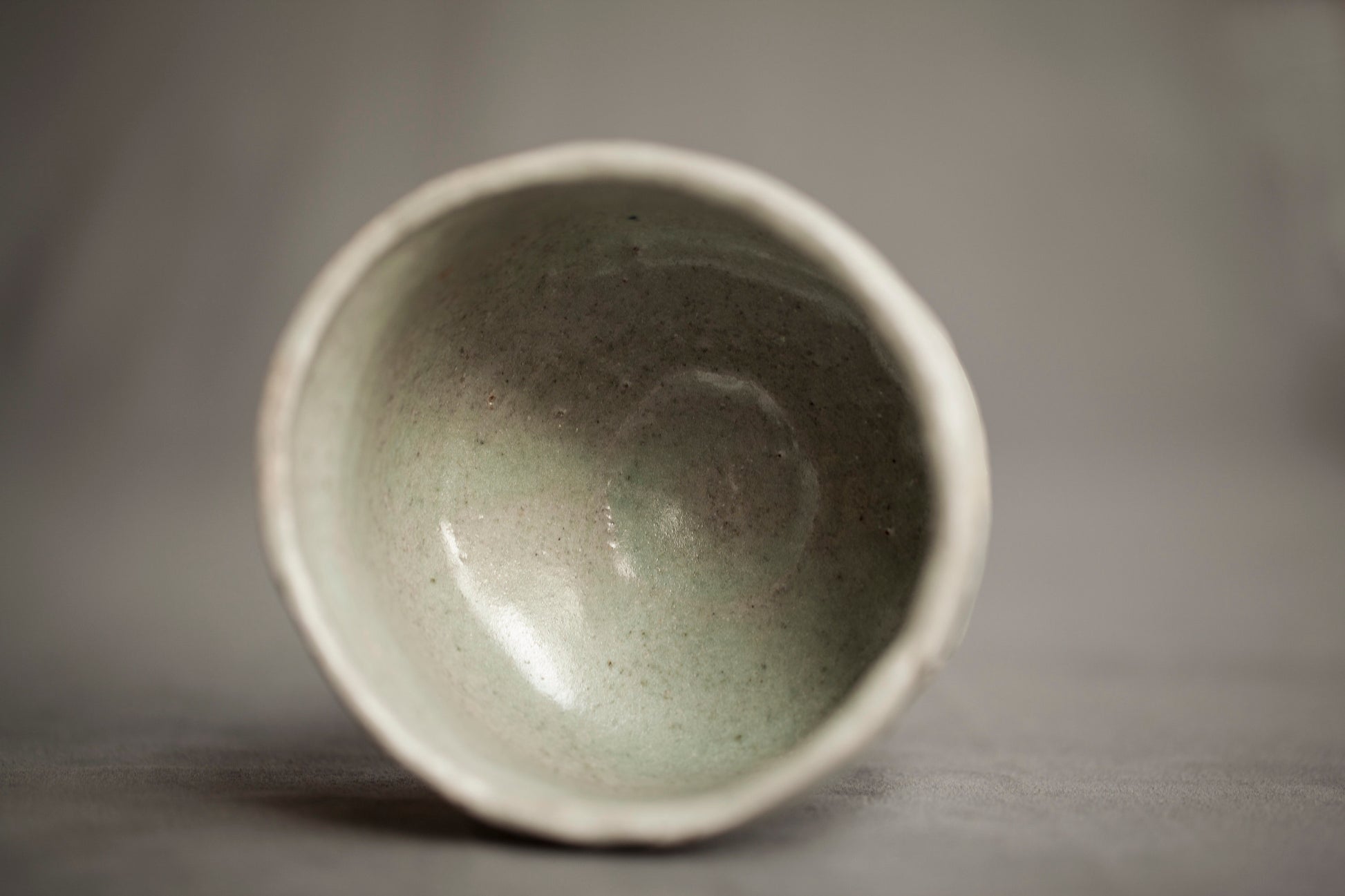 This tea bowl is covered with celadon glaze. This chawan was fired in an anagama kiln for 80 hours. The temperature reached 1350 degrees (wood fired).