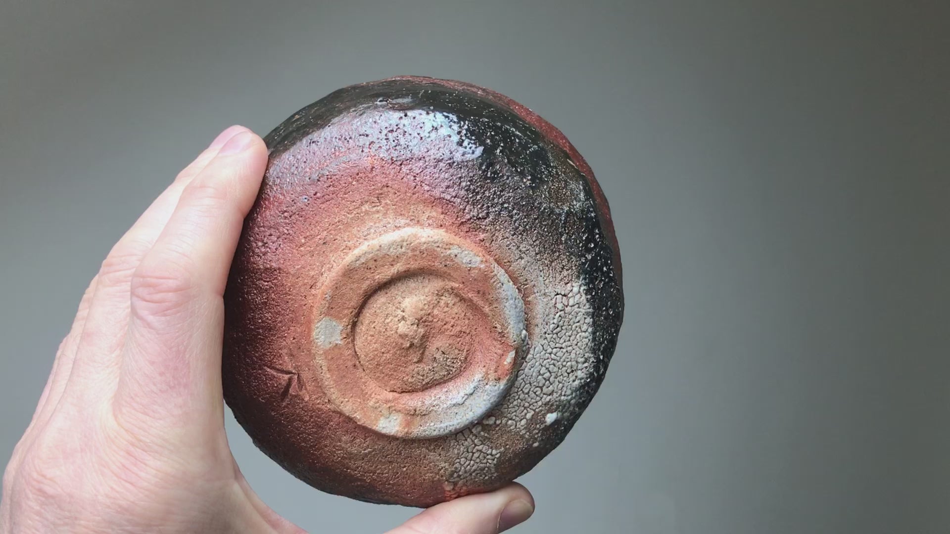This tea bowl is covered with chino glaze and wood ash. Natural wood ash: pottery surface is left unglazed and takes on color and markings during the firing from the melted wood ash. It was fired in an anagama kiln for 80 hours. The temperature reached 1350 degrees (wood fired).