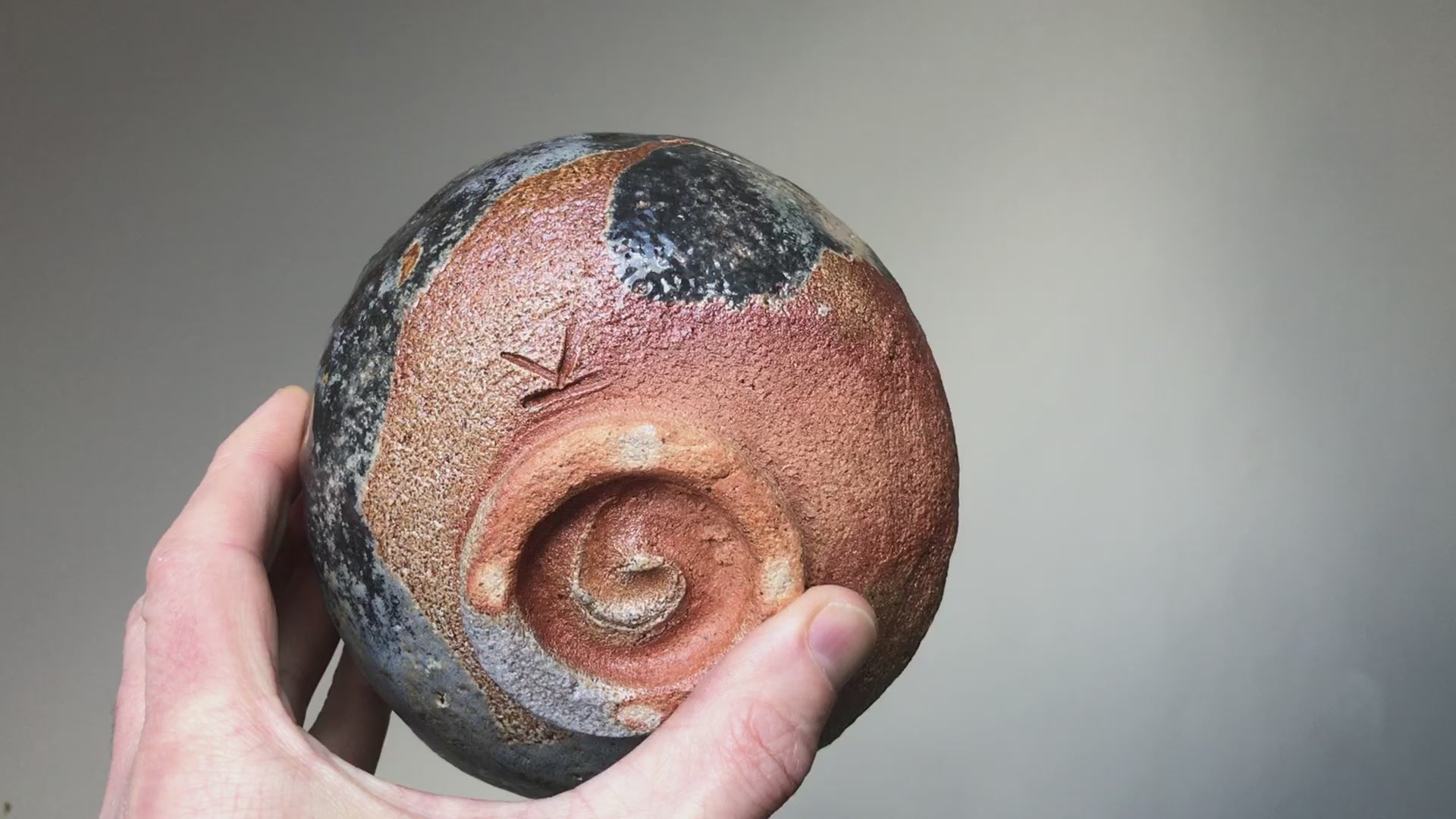 This tea bowl is covered with chino glaze and wood ash. Natural wood ash: pottery surface is left unglazed and takes on color and markings during the firing from the melted wood ash. It was fired in an anagama kiln for 80 hours. The temperature reached 1350 degrees (wood fired).