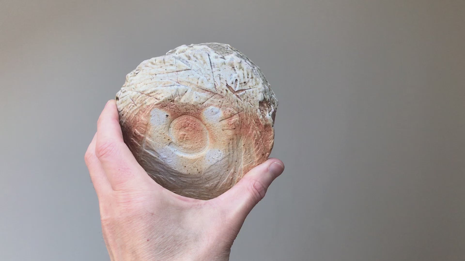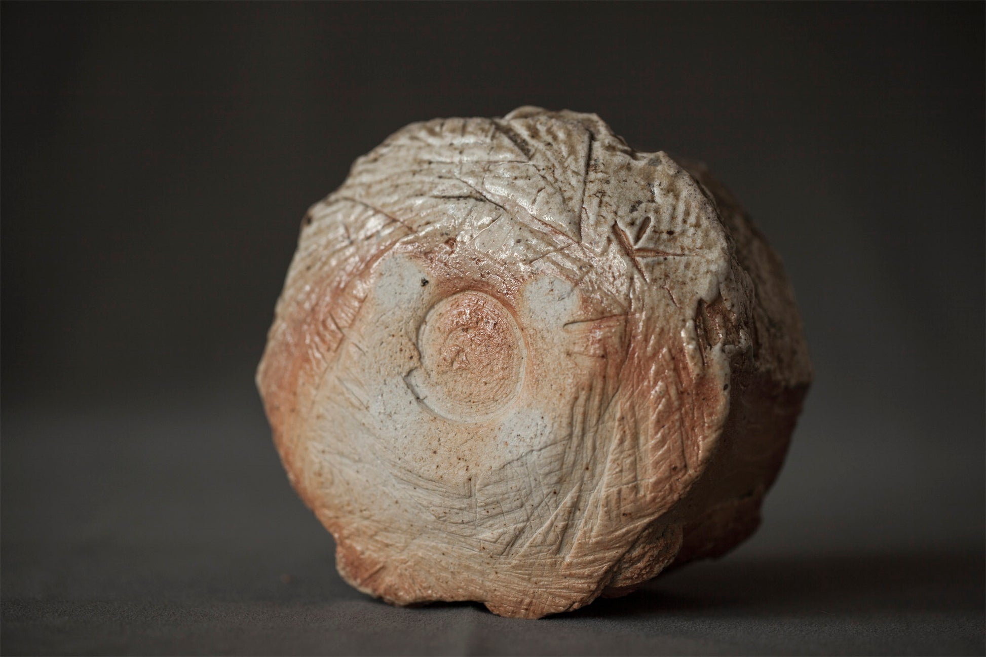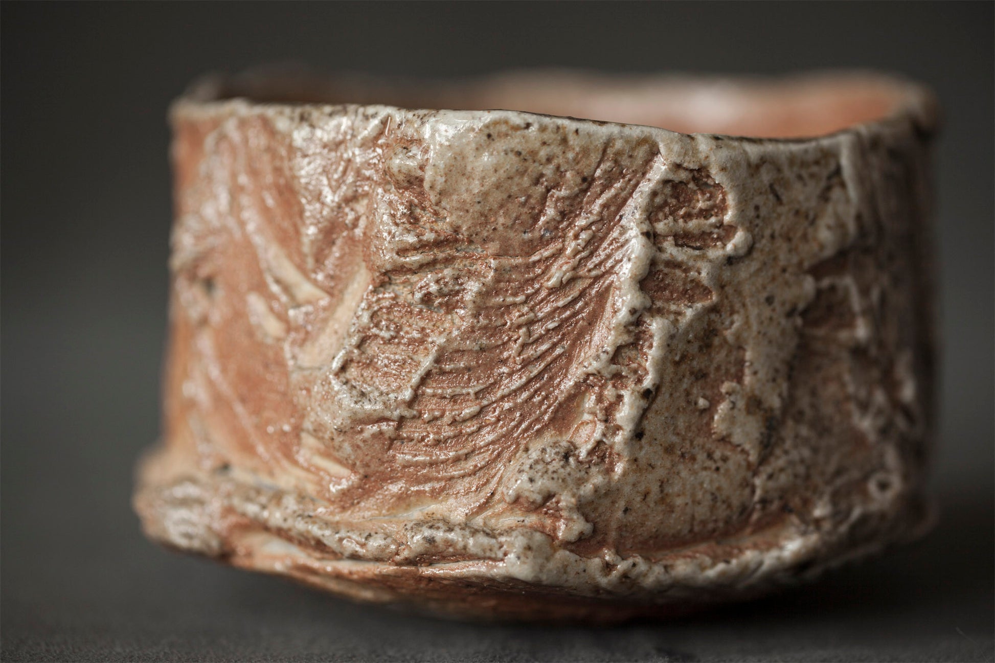 This tea bowl is covered wood ash. Natural wood ash: pottery surface is left unglazed and takes on color and markings during the firing from the melted wood ash.. This chawan was created for communication, and it also does it on a tactile level...