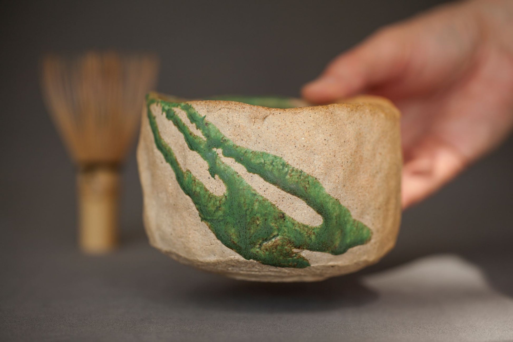 Inside, the tea bowl is covered with matte green glaze. There is a shallow dent called “Chadamari”at the center of the tea bowl. Chadamari, cha damari: The tea well. Where the last of the tea will pool. The matte, dark finish accentuates the beautiful lush green of the tea. Outside, green glaze and wood ash partially covers the clay. There are protrusions on the walls of the bowl. Very comfortable to hold. Your hands will feel the warm and texture of this ceramic. It is simple, natural look gives any matcha session a pure and classy atmosphere. Clay is collected not far from my house where I live. Compounded of several clays selected for their plastic qualities, along with coarse fire-clay and added grog for texture.