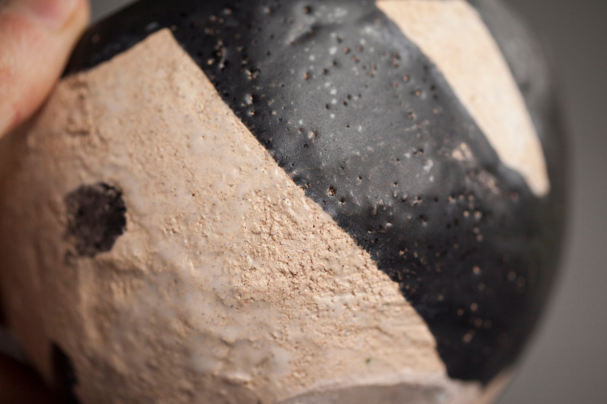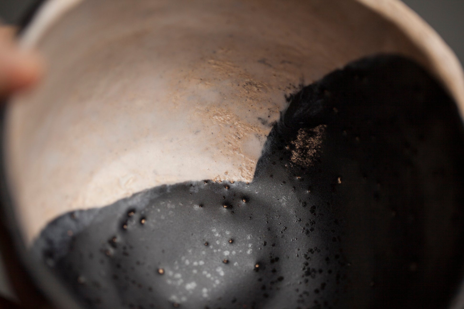 The tea bowl is covered with transparent and black matte glaze. There is a shallow dent called “Chadamari” at the center of the tea bowl. Chadamari, cha damari: The tea well. Where the last of the tea will pool. Outside, transparent glaze + black glaze partially covers the clay. Your hands will feel the warm and texture of this ceramic. The matte black glaze finish accentuates the beautiful lush green of the tea. It is simple, natural look gives any matcha session a pure and classy atmosphere. Clay is collected not far from my house where I live. Compounded of several clays selected for their plastic qualities, along with coarse fire-clay and added grog for texture.