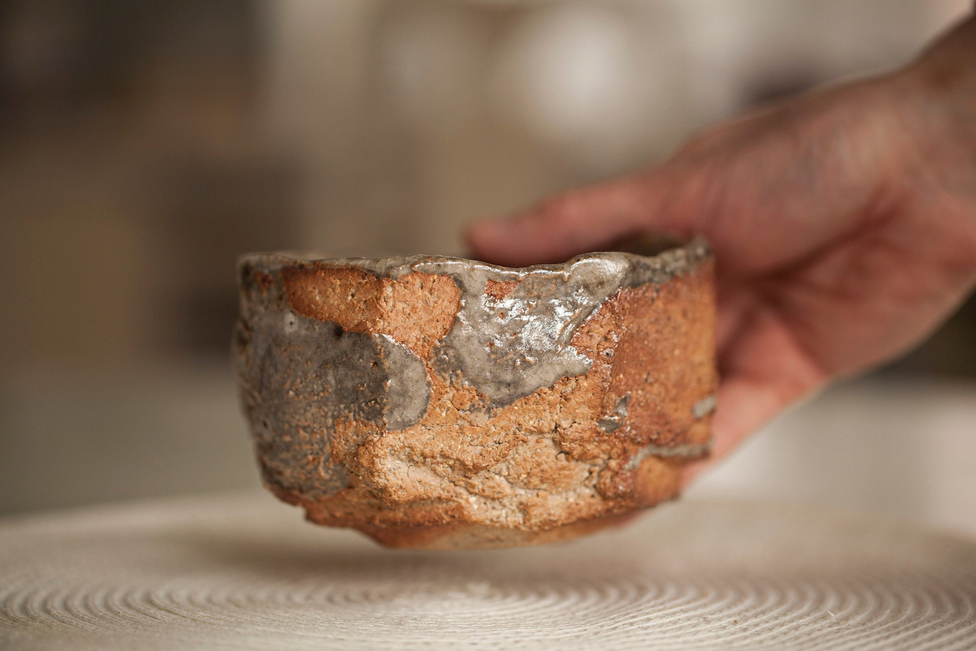 Chawan are molded using the "tezukune" technique (hand-forming), with the palms of the hand: clay is shaped into a dense, flat circle and built up by compressing between the palms. When dry enough, the rough and imperfect clay is trimmed with an iron scraper - "kurinuki" technique . Then it is covered with glaze and fired at high temperature. All glazes and clay used are “food safe”