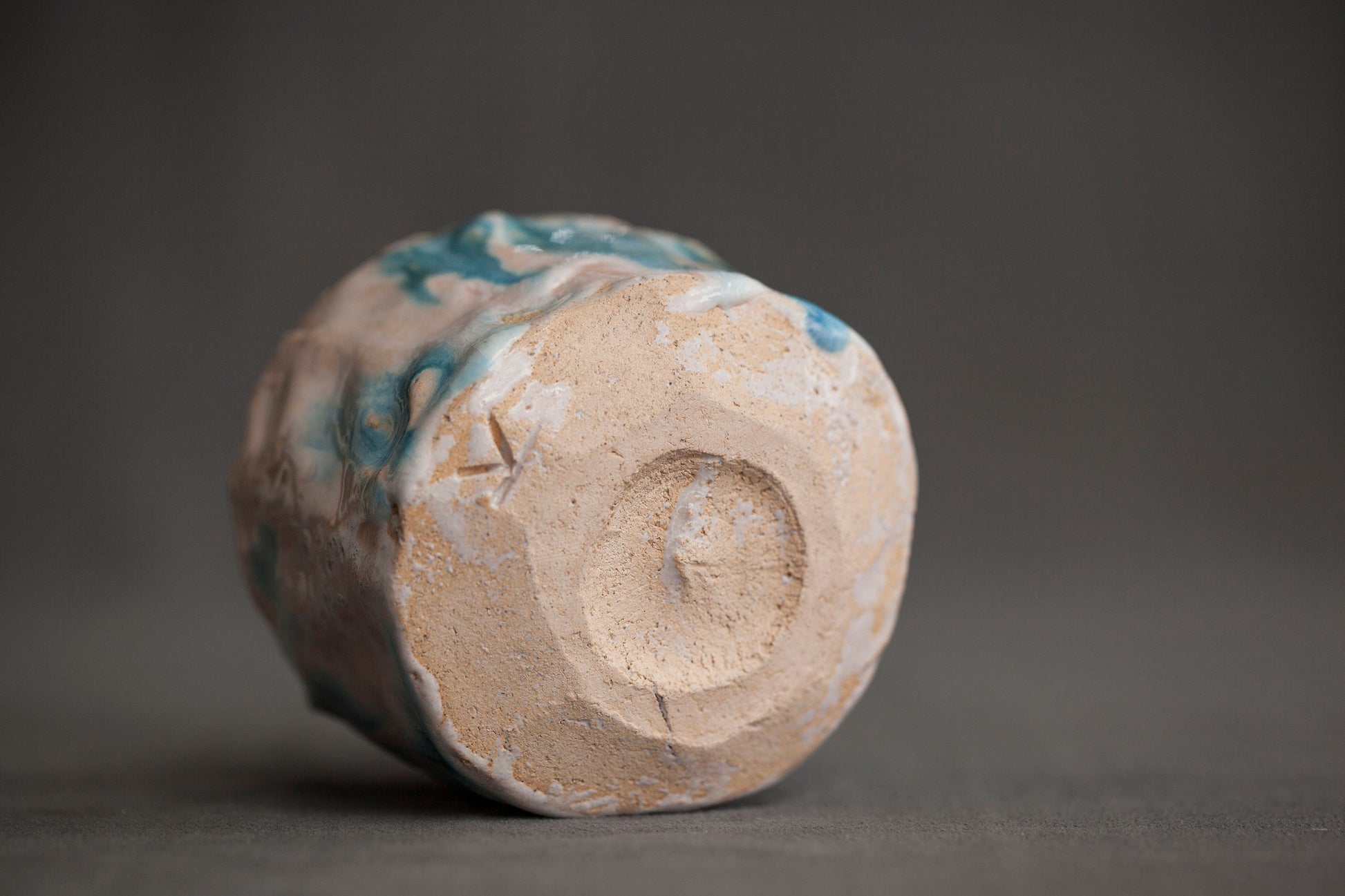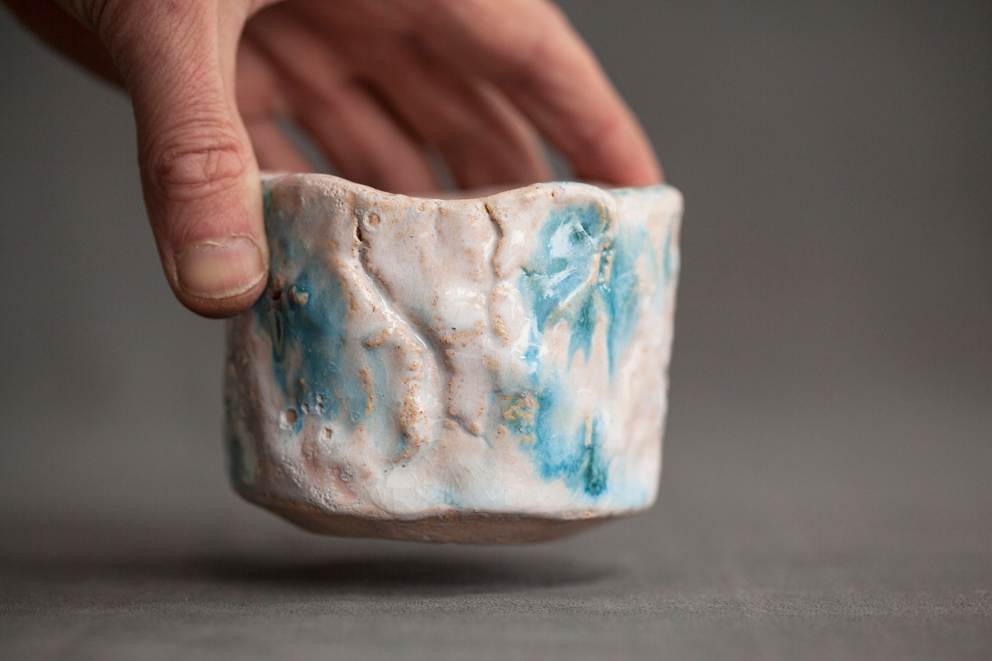 This is a hand formed faceted tea cup  carved out of stoneware clay.