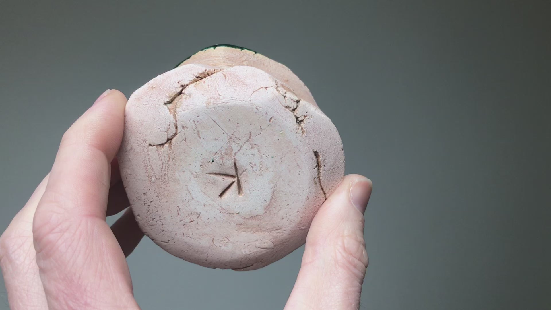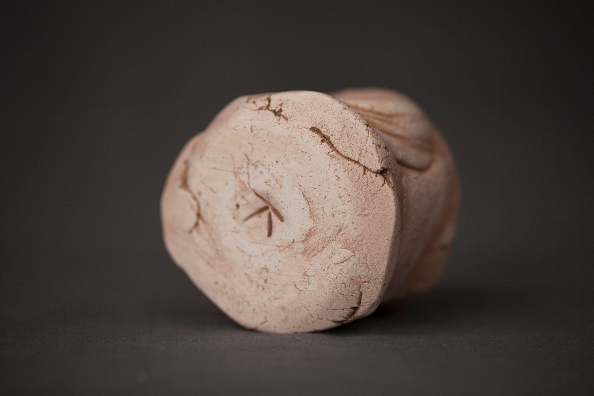 This is a hand formed faceted tea cup carved out of stoneware clay.